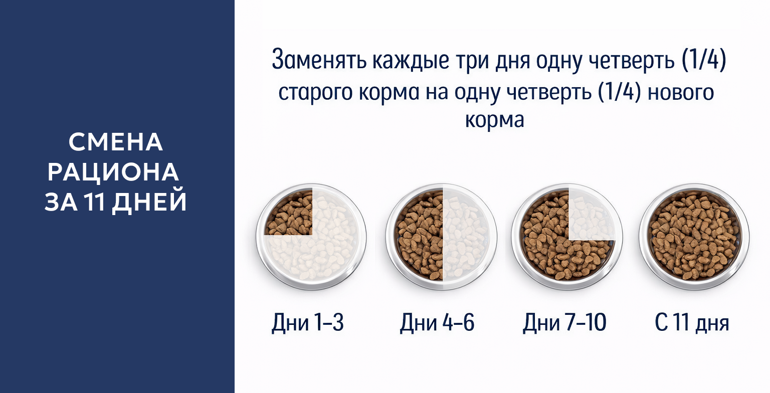 Переход проводят постепенно. В среднем он занимает от семи до десяти дней. За это время долю новой еды увеличивают без резких изменений.
